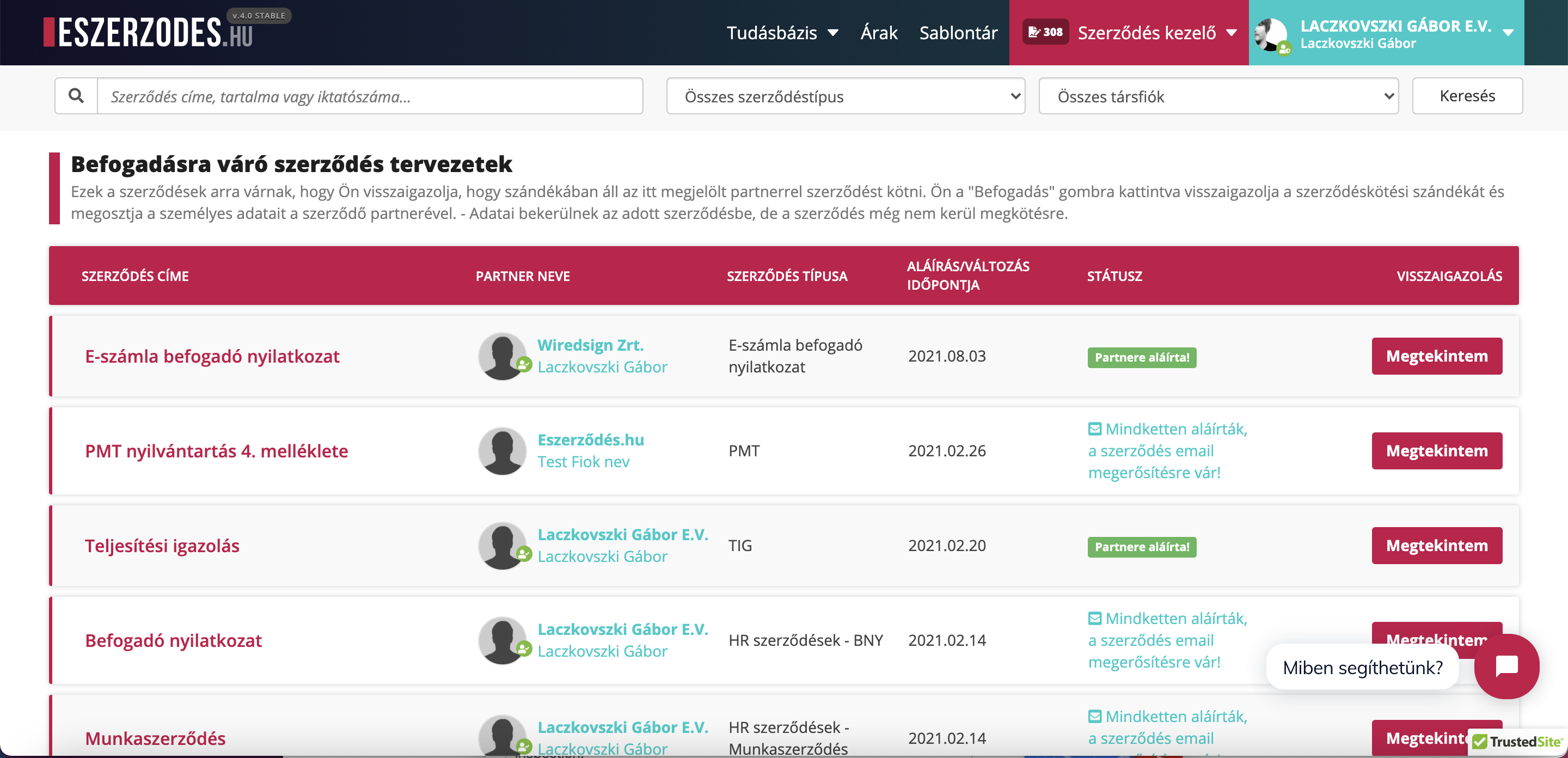 A szerződéseid státuszok szerint rendezve ellenőrizheted. A folyamatban lévő szerződéseknél nem csak azt láthatod ki nem írta alá a szerződést, hanem olyan elakadásokat is, hogy megérkezett-e a szerződés meghívó a partneredhez, megnyitotta-e a leveled és hogy olvasta-e már a szerződésed. A rendszer automatikus emlékeztetőket küld helyetted az aláirandó szerződésekről partnerednek.